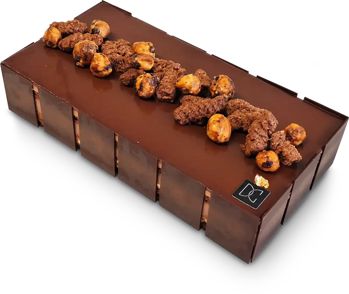 Biscuit croustillant au chocolat, crémeux aux grands crus de chocolat Madagascar 33 % et Équateur 66 %, parfumé à la fève de tonka, mousse au chocolat au lait Madagascar 33 % et streusel au chocolat.