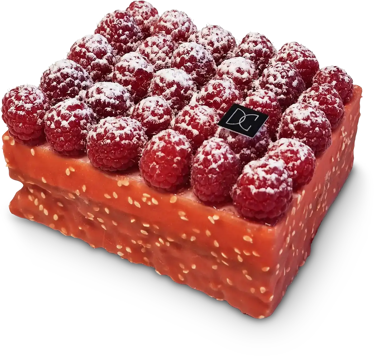 Croustillant aux flocons d'avoine, dacquoise aux amandes, compotée de framboises et litchis, mousse à la framboise et framboises.