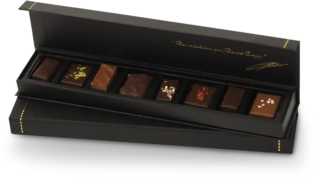 Un assortiment de huit chocolats noirs, au lait et pralinés. Ce coffret élégant est idéal pour offrir ou s’offrir un délicieux moment chocolaté.