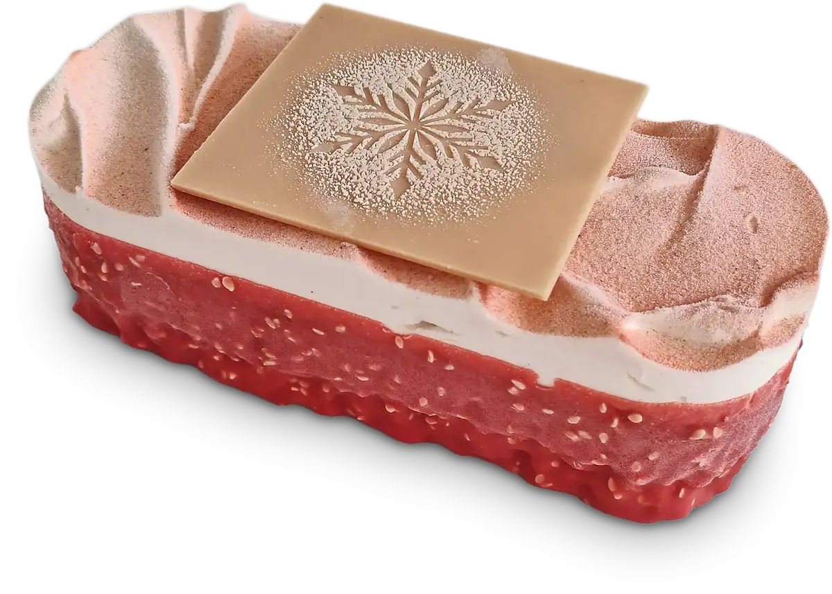 Une bûche glacée élégante et rafraîchissante. Dacquoise amande, éclats croustillants aux flocons d’avoine, sorbet fraise-framboise vibrant et crème glacée parfumée à la fève de tonka.