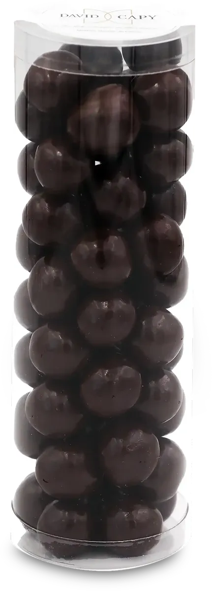 Noisettes torréfiées enrobées de chocolat noir pour grignoter à toute heure de la journée.