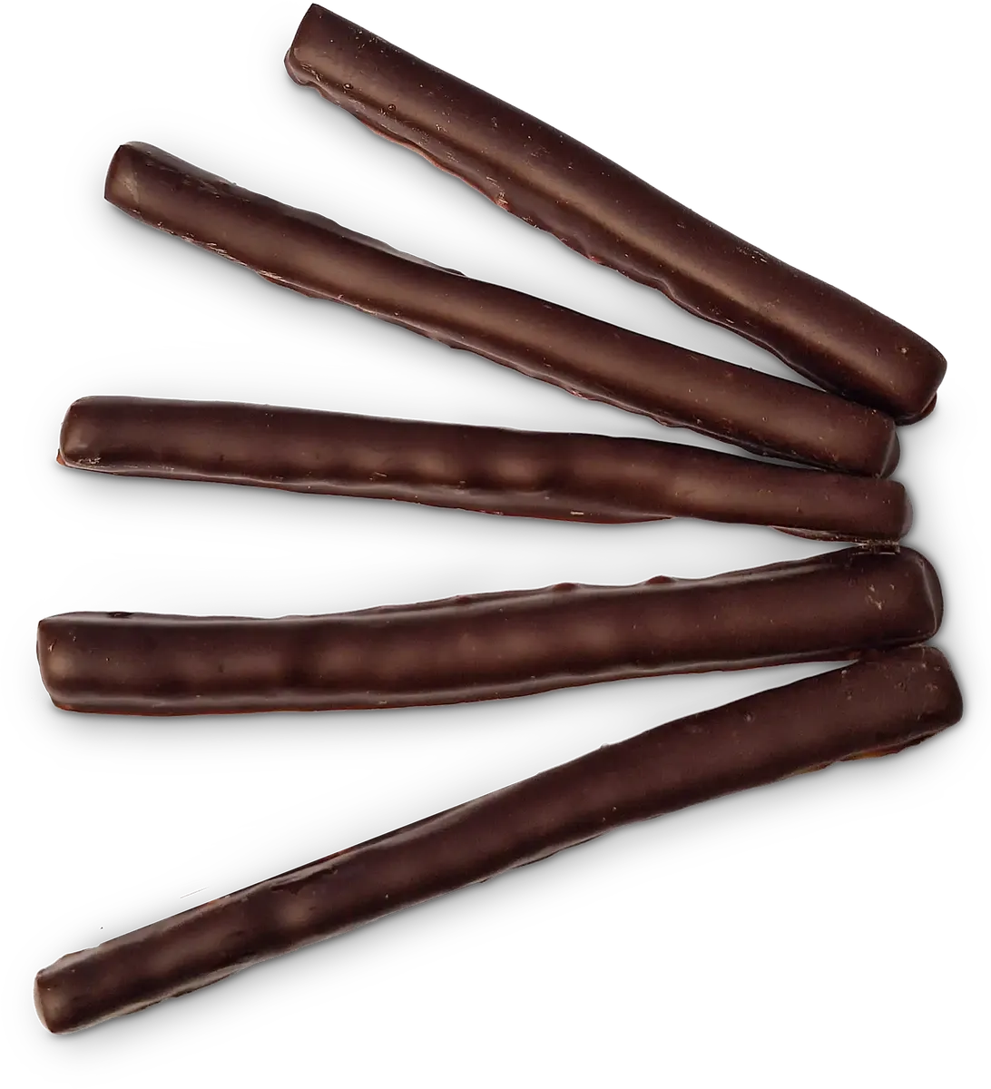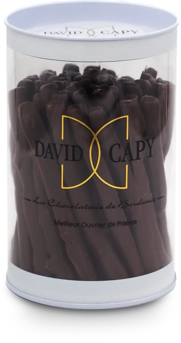 Écorces de orange confites, enrobées de chocolat noir 61% d'Amérique du Sud et parsemées de grué de Caccao (fèves de cacao torréfiées et concassées).