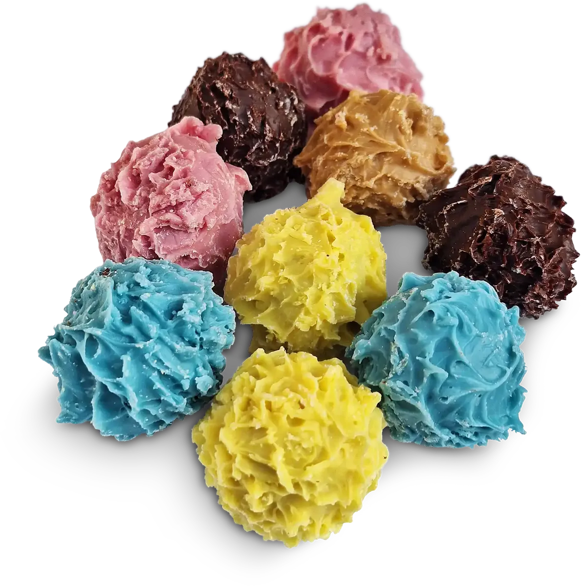 L'assortiment est réalisé avec 3 alcools : Framboise 60% d'alcool (rose) enrobé de Chocolat Blanc, PoireWilliams 45% d'alcool (marron) enrobé de Chocolat Noir et Mirabelle 60% d'alcool (jaune) enrobé de Chocolat Blanc. Le chardon de couleur Bleu est réalisé sans alcool, composé d'une Ganache Praliné Noisette et Grains d'amande caramélisés enrobé de Chocolat Blanc, pour toute la famille.
