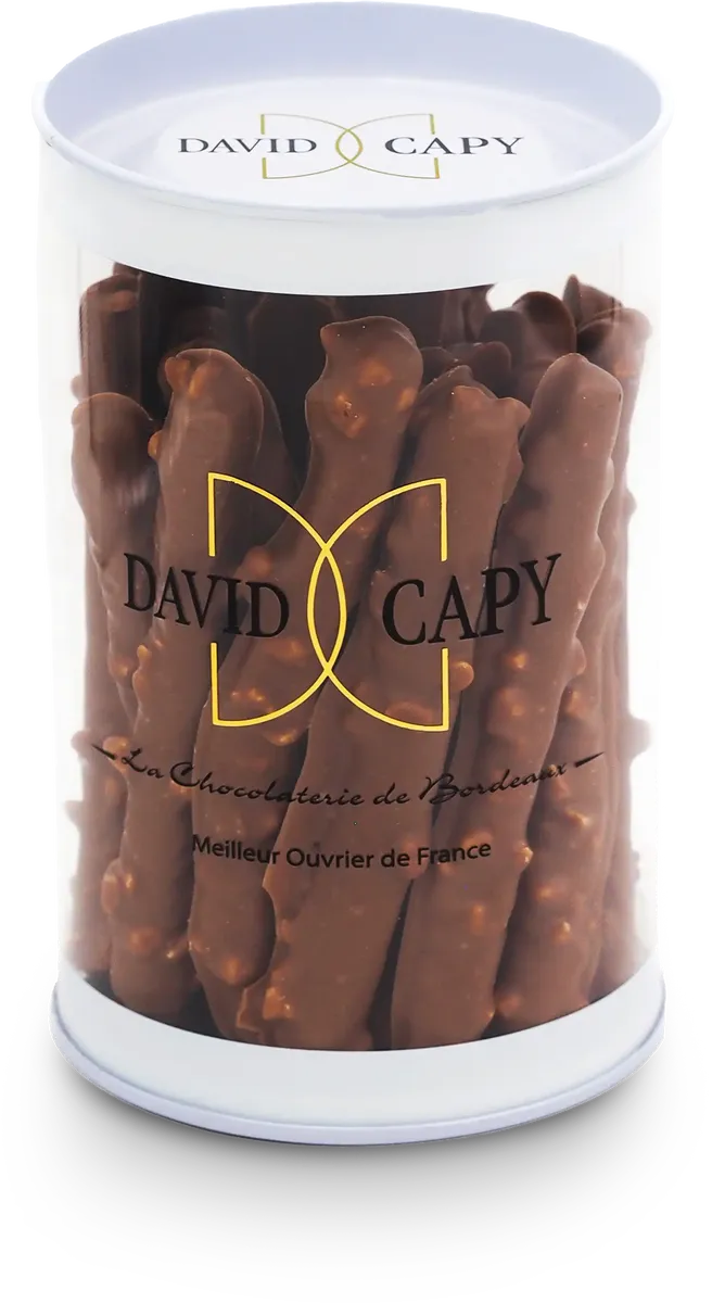 Écorces de citron confites, enrobées de chocolat au lait 40% d'Amérique du sud et parsemées d'éclats d'amande.