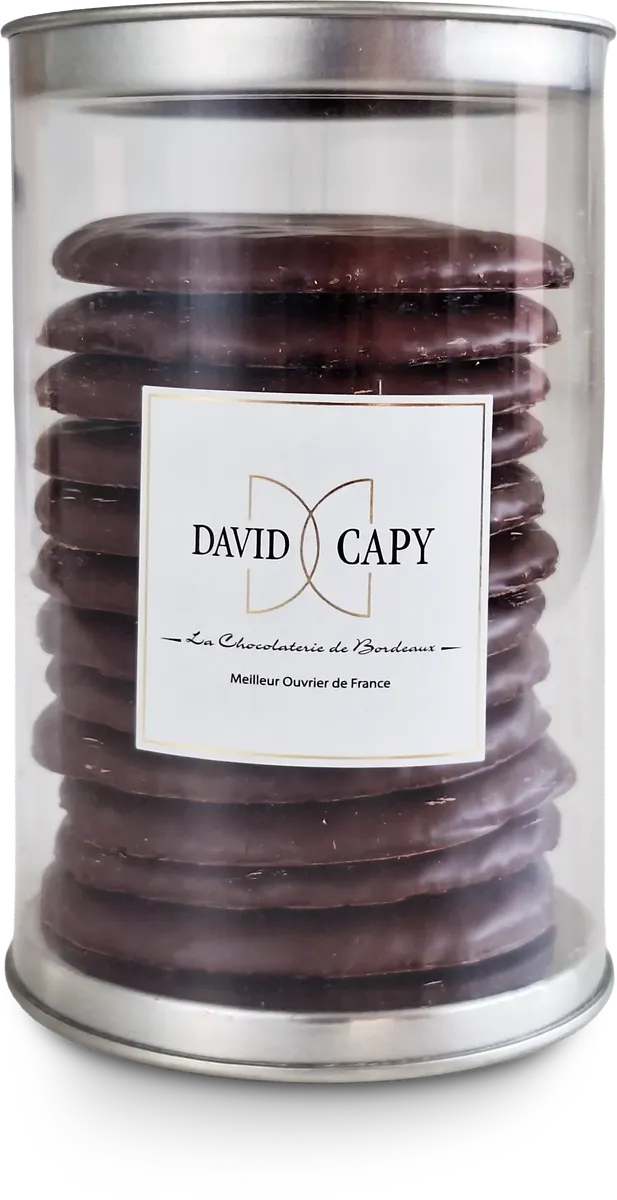 Sablés tout chocolat noir avec une pointe de fleur de sel enrobés de chocolat noir 61% de cacao.