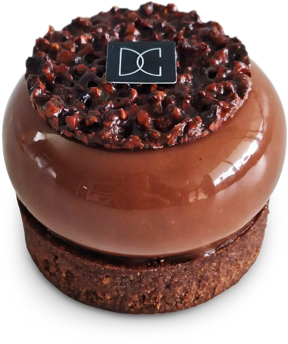 Pâte sablée au chocolat, caramel à la fève de cacao, crème fondante Cuvée Sao Tomé 76% de cacao et nougatine aux éclats de fève de cacao.