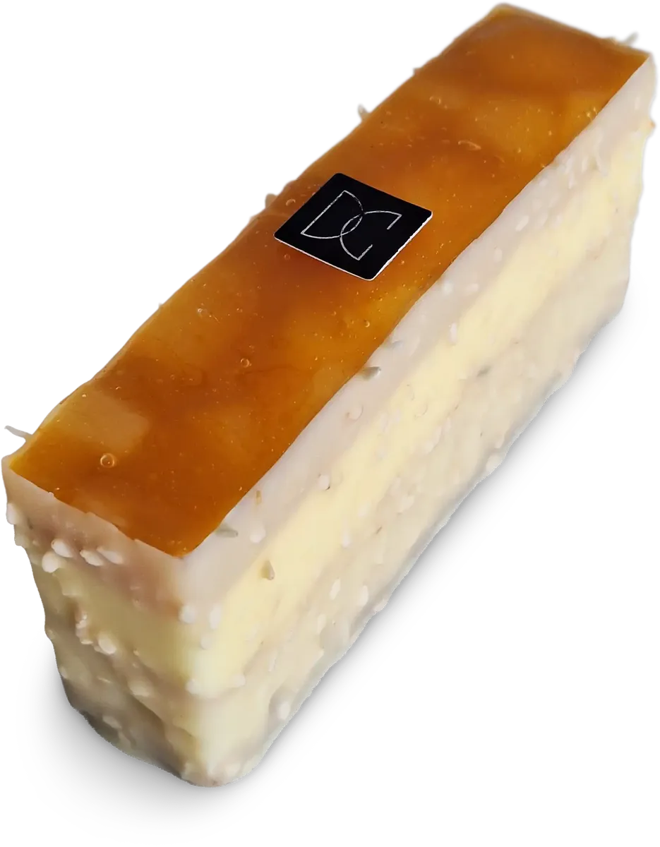 Biscuit amande et son croustillant aux flacons d'avoine, coeur garni d’une compotée d’Ananas et de Mangue, Acidulé au jus de citron vert, mousse rafraichissante au citron vert.