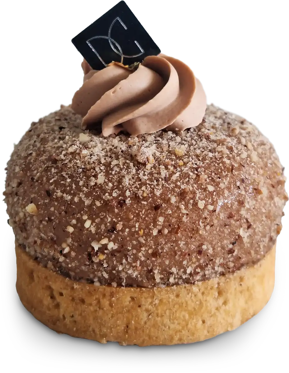 Pâte sablée aux amandes, crémeux praliné, noisettes entières caramelisées, cœur coulant praliné, crème aérée chocolat lait, noisettes et Rosace crémeuse au praliné.