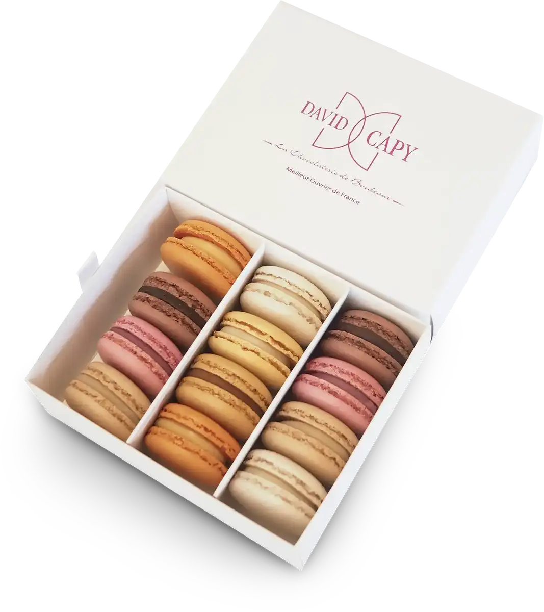 Découvrez nos 7 saveurs de macaron dans cet étui de 12 macarons: